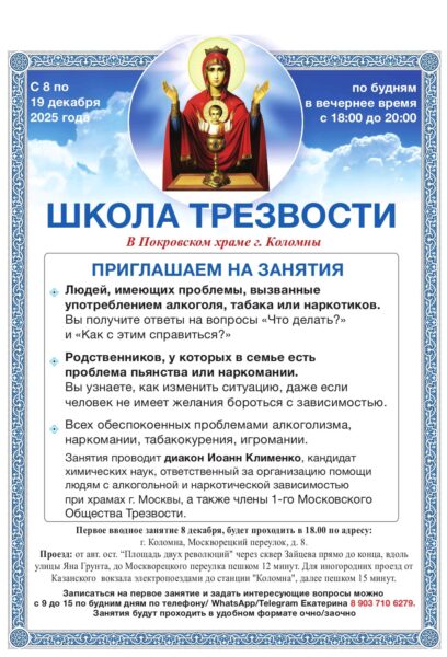С 8 по 19 декабря в будние дни в Покровском храме города Коломны будет проведен курс занятий Школы трезвости.